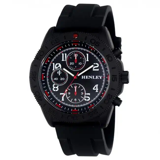 Satin black sports watch with decorative push buttons. This timeless sports case features a stylish dial featuring striking cosmetic mini eye dials and colourful soft silicone strap with coloured co-ordinated stitching. Available in black, blue, red and racing green. All Henley Mens fashion watches come packed in the deluxe Henley Mens mink / grey presentation gift box.